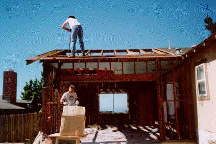 A few friends were able to make it, and we set them to bashing the stucco off the exterior and removing the roof.