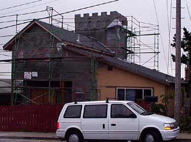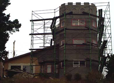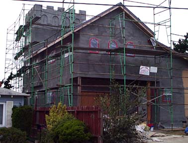 After starting to do the stonework myself, I decided to have a mason finish it - I'm too messy! The faux half-timbering (Hardiplank cut to various widths and mortared in place) I did myself, then the stucco contractor finished his job.