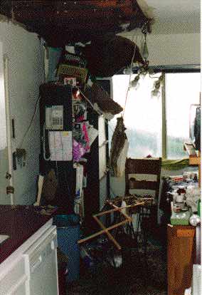The tarp, unfortunately, didn't survive the next storm. But the sheathing alone has been sufficient unto the task of keeping out the worst of the weather. But not all. We lost the dining room ceiling in early February.