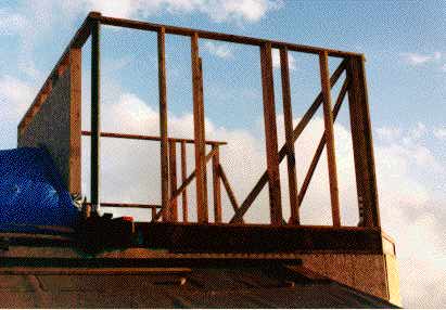 The east wall had to be built to support the second floor roof trusses, and the north and south walls had to be built to support the east wall. The central pole of the spiral staircase is in the near corner in the photo.